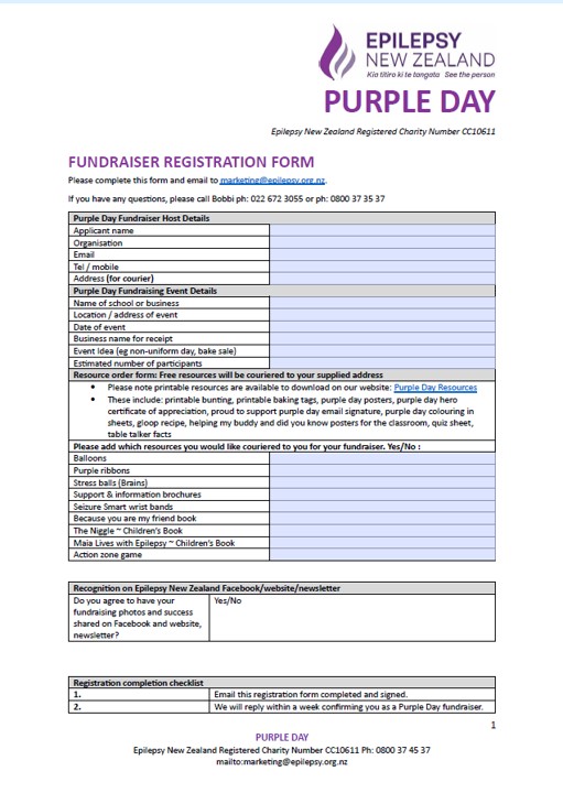 Please complete and email a signed copy to fundraise for Epilepsy New Zealand: Purple Day Fundraising Registration Form
